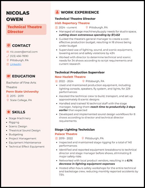 Technical Theater Resume Template - Theater tech resume examples for 2024. Creating a stunning theatre resume is easier than you think. Check out our three technical theatre resume templates and see which one gives your personal attributes the best visual. Our seven theatre resume samples and writing advice will help you land your next theatre job in 2024. Write a perfect technical theatre resume with.